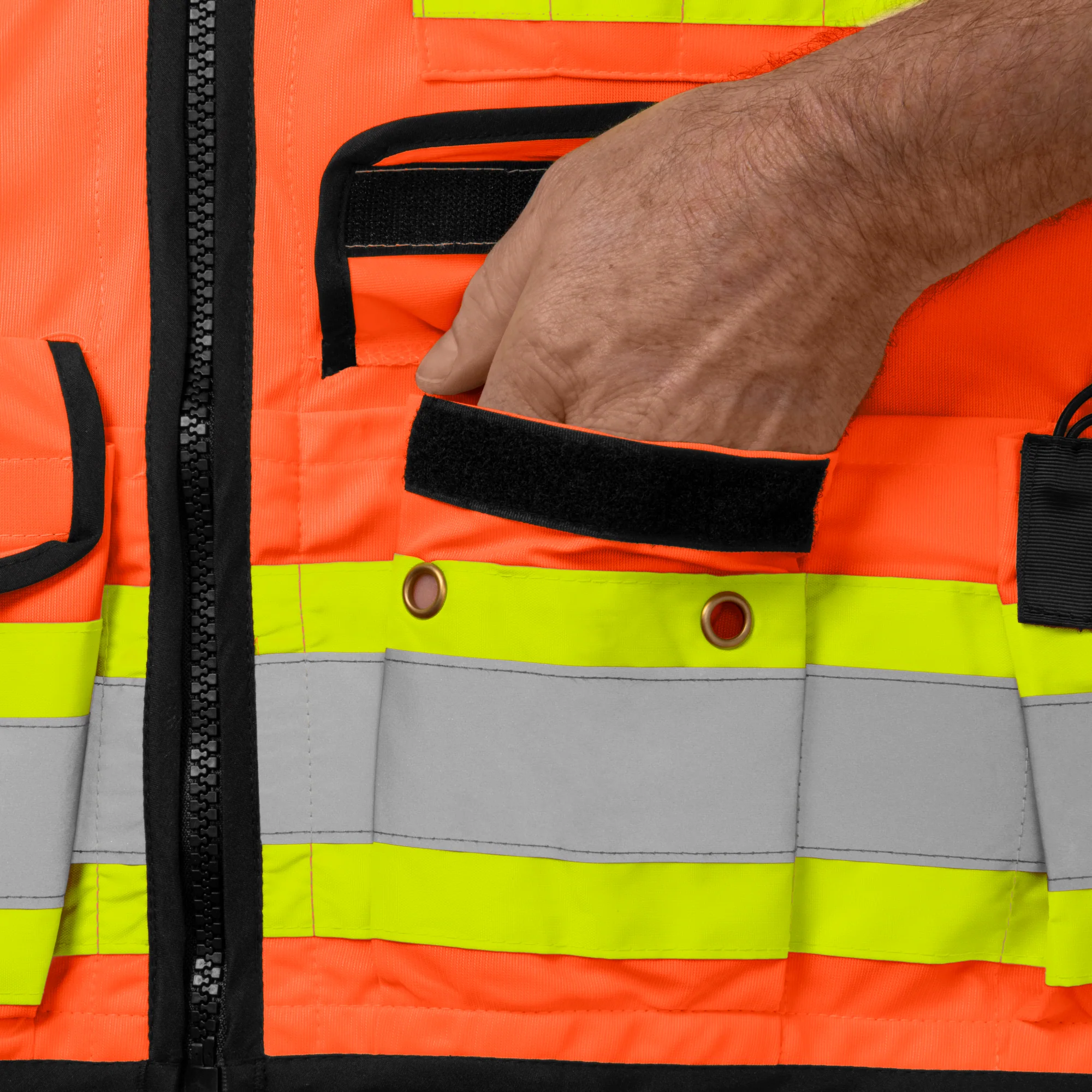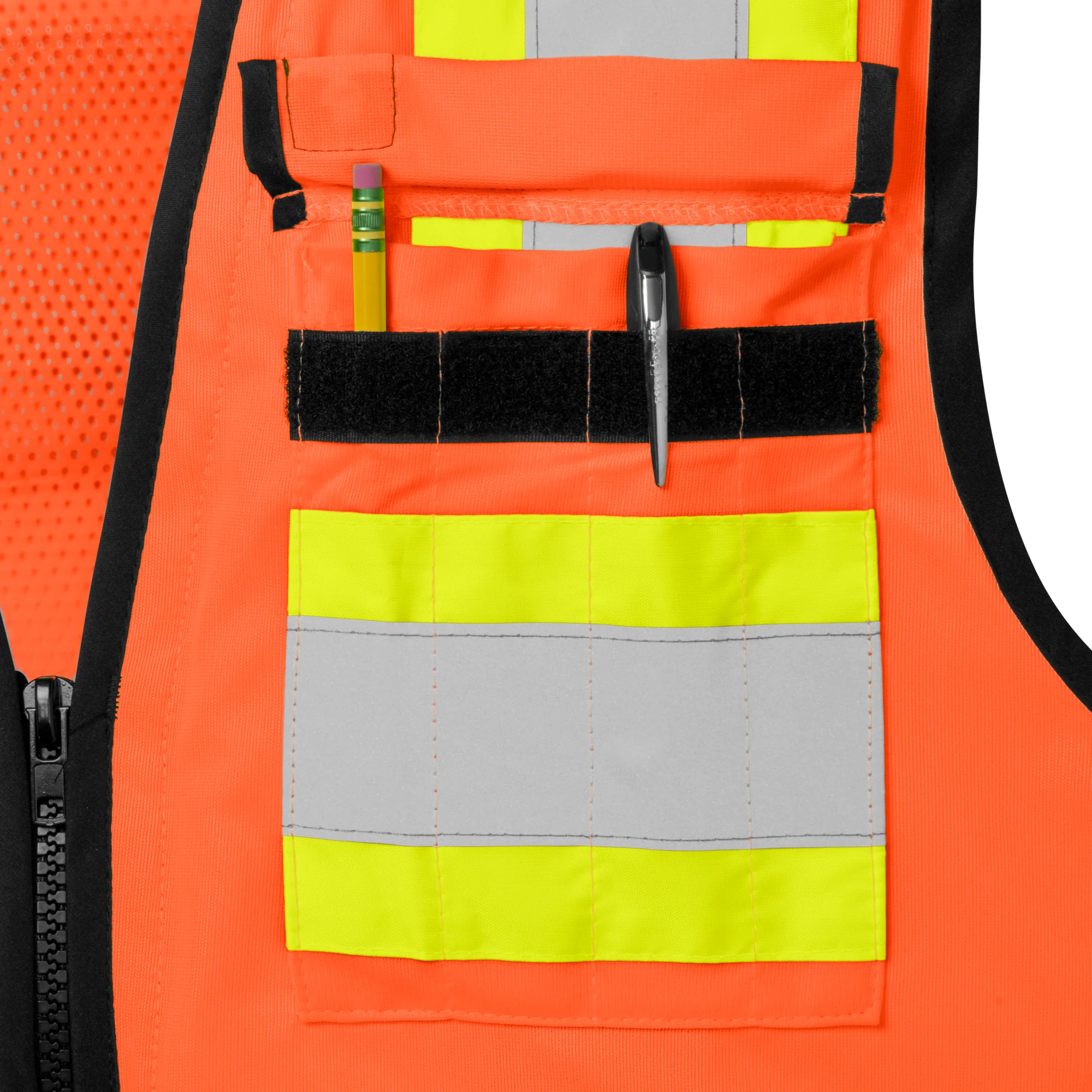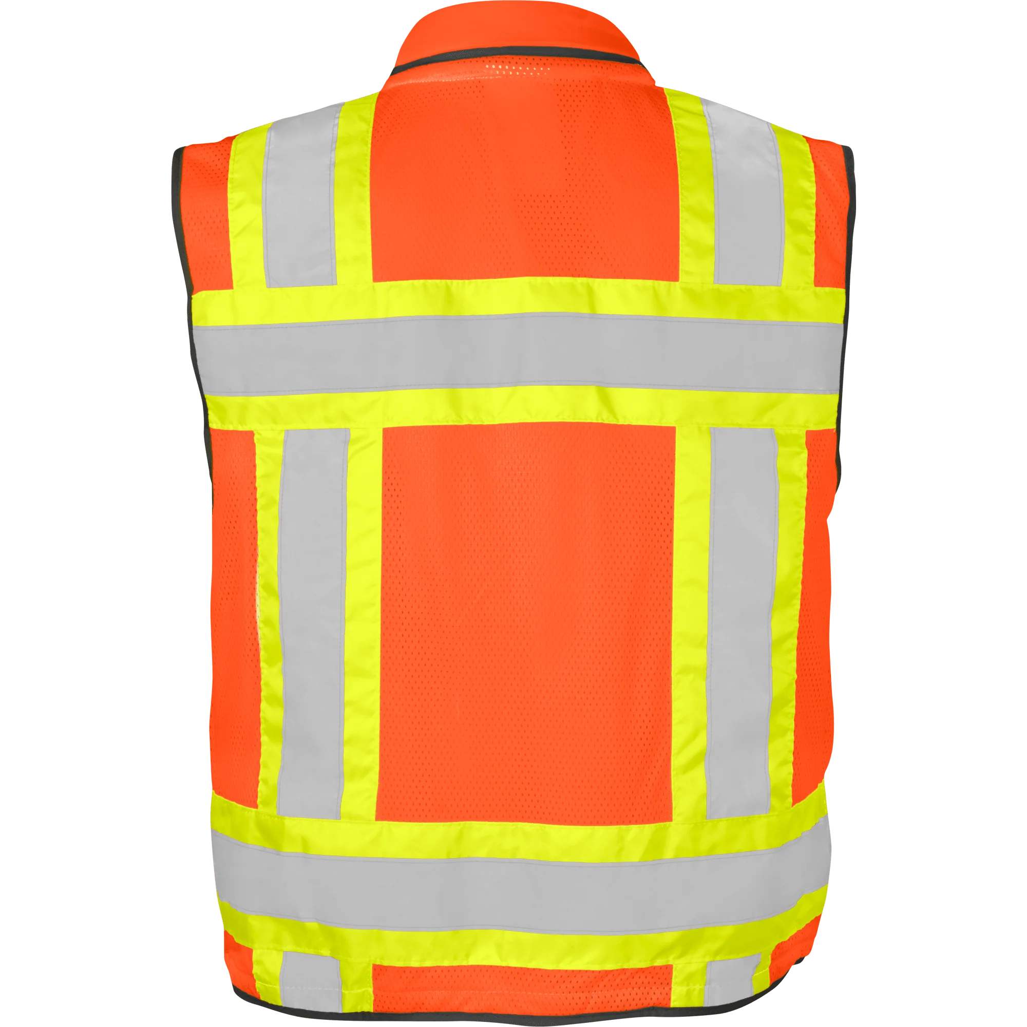 • Reflective detailing: 2″ silver reflective tape layered over contrasting orange and lime panels boosts visibility in low-light conditions.