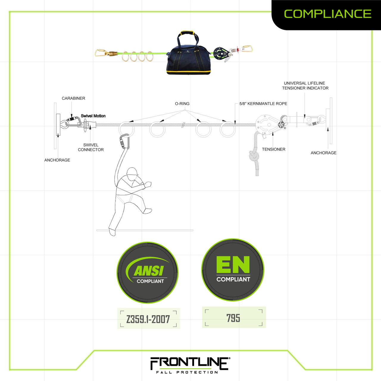 Frontline presents an innovative 4-person temporary horizontal lifeline constructed with 5/8" diameter kernmantle rope and a specially engineered tensioner built into the lifeline system. This safety equipment features 4 mobile anchor o-rings crafted from premium-grade alloy steel.