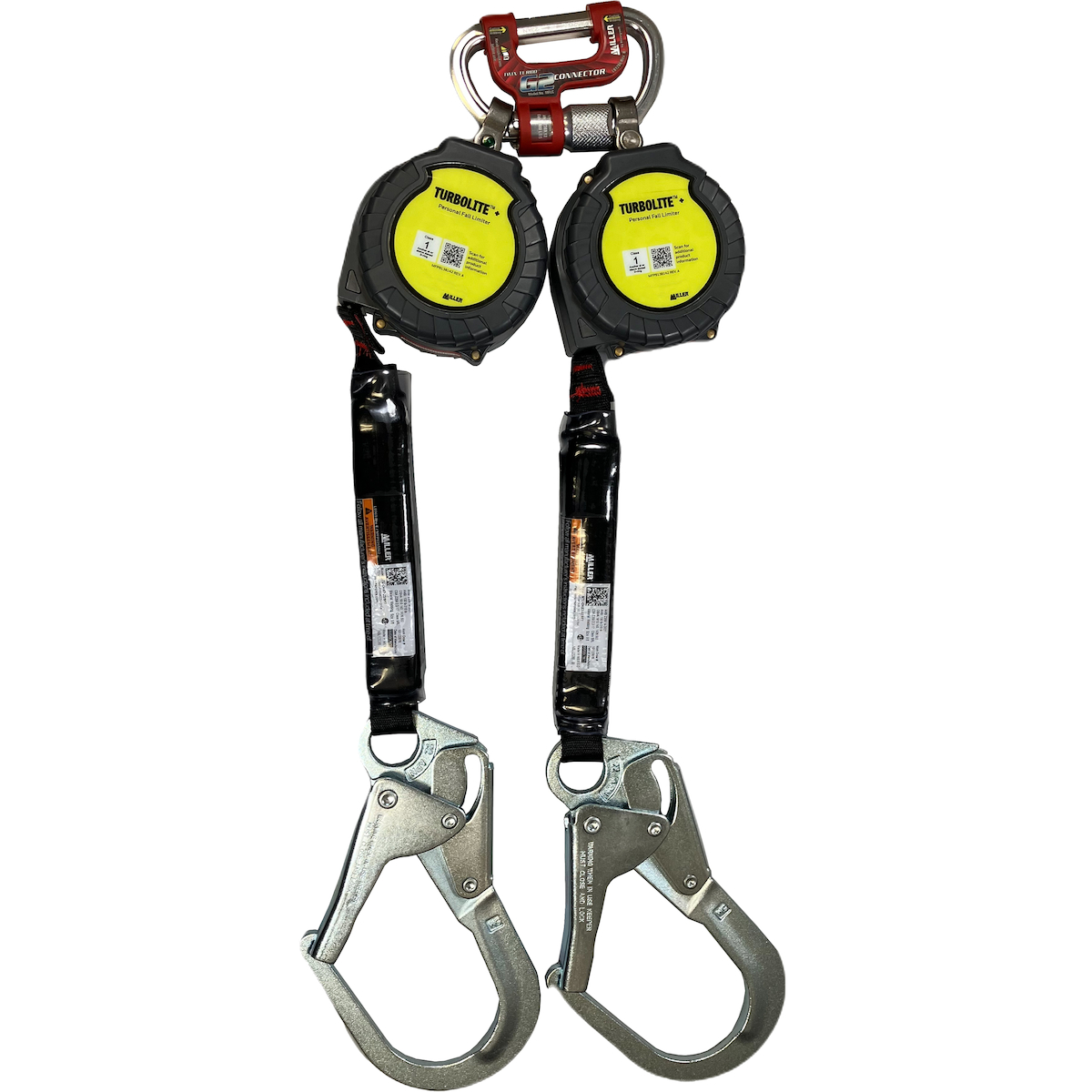 • Miller 5K® locking snap hooks with 5,000 lb gate load capacity for secure connections