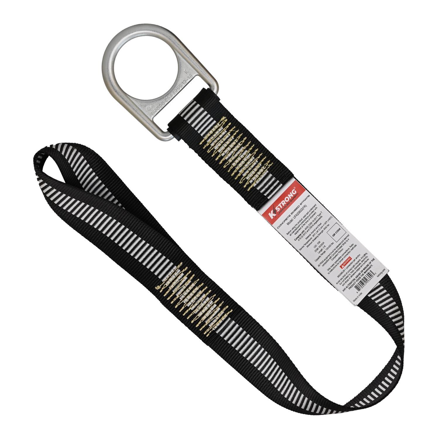 • D-Ring: Alloy Steel D-Ring (breaking strength 5000 lbs min) on one end with a textile loop on the other