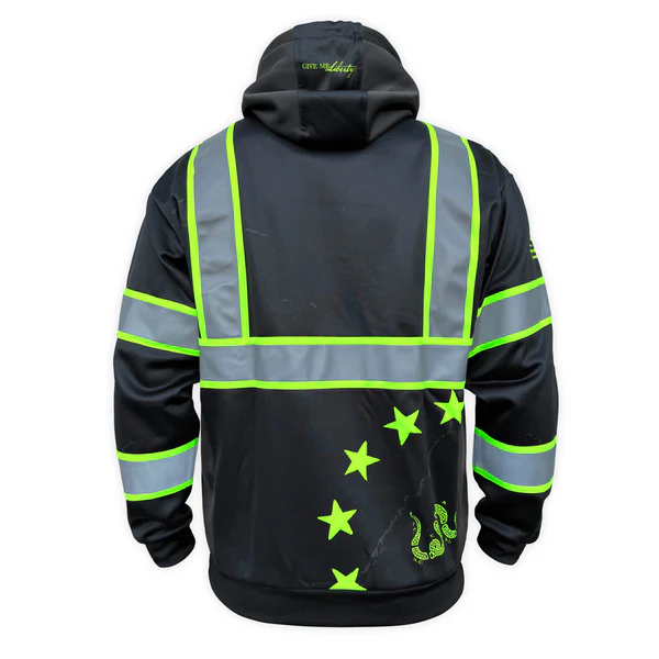 Elevate your work gear and stand out on the jobsite with the SafetyShirts SS360 1776 Class 2 Type-O hoodie, showcasing a bold graphic inspired by the Betsy Ross flag. This patriotic piece boosts on-site visibility while delivering dependable warmth and comfort when the temperatures drop. A roomy hood and plush fleece interior make it an easy go-to for long days outside. Step up your workwear lineup with the SS360 hoodie.